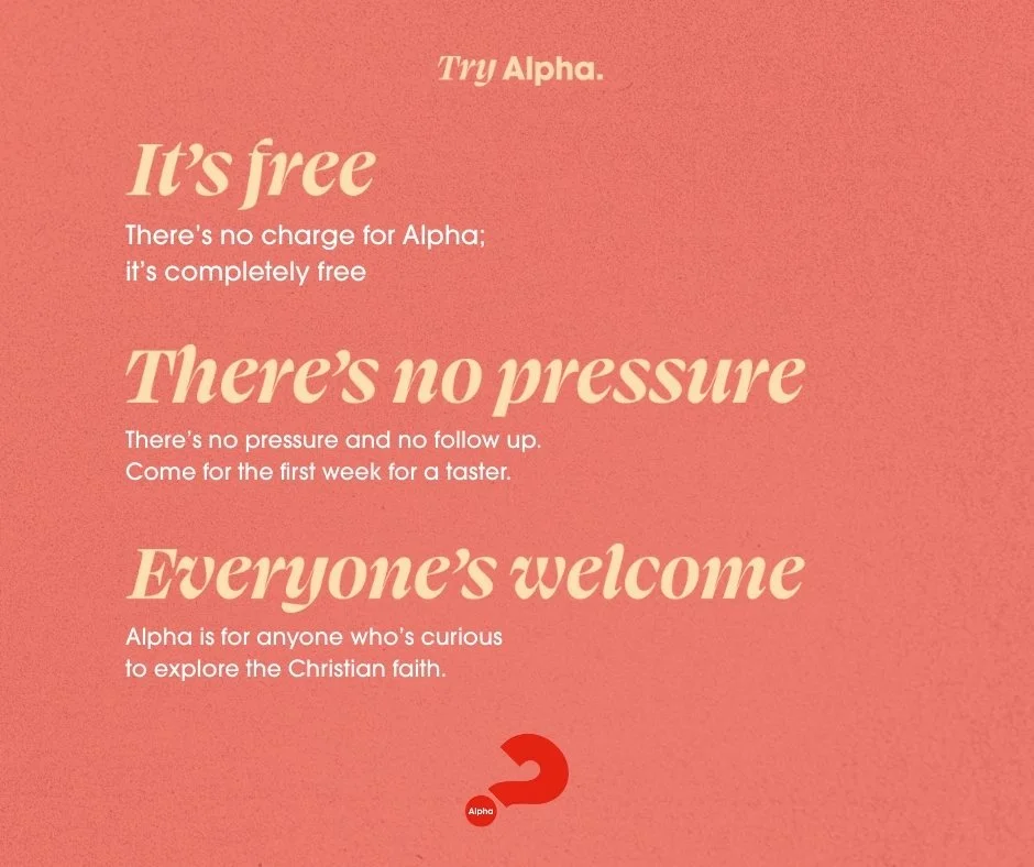 Each Alpha session consists of three elements: Connect, Watch & Discuss. It's a time to connect with others, enjoy and take in the Alpha videos, and have a conversation about the topic of the week. The course is free to attend.